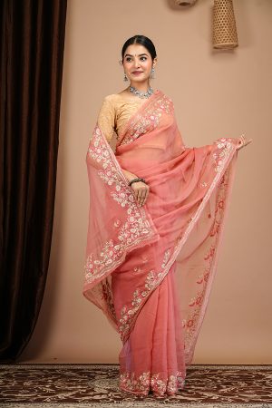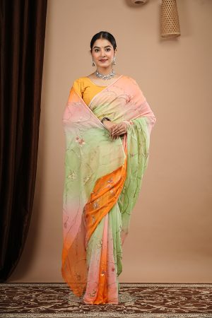 • Pink and Orange Shaded Viscose Chiffon Saree