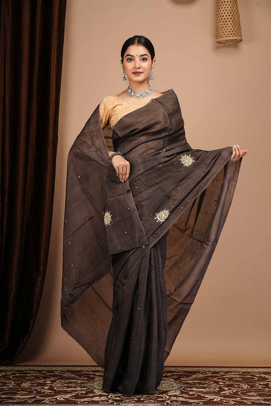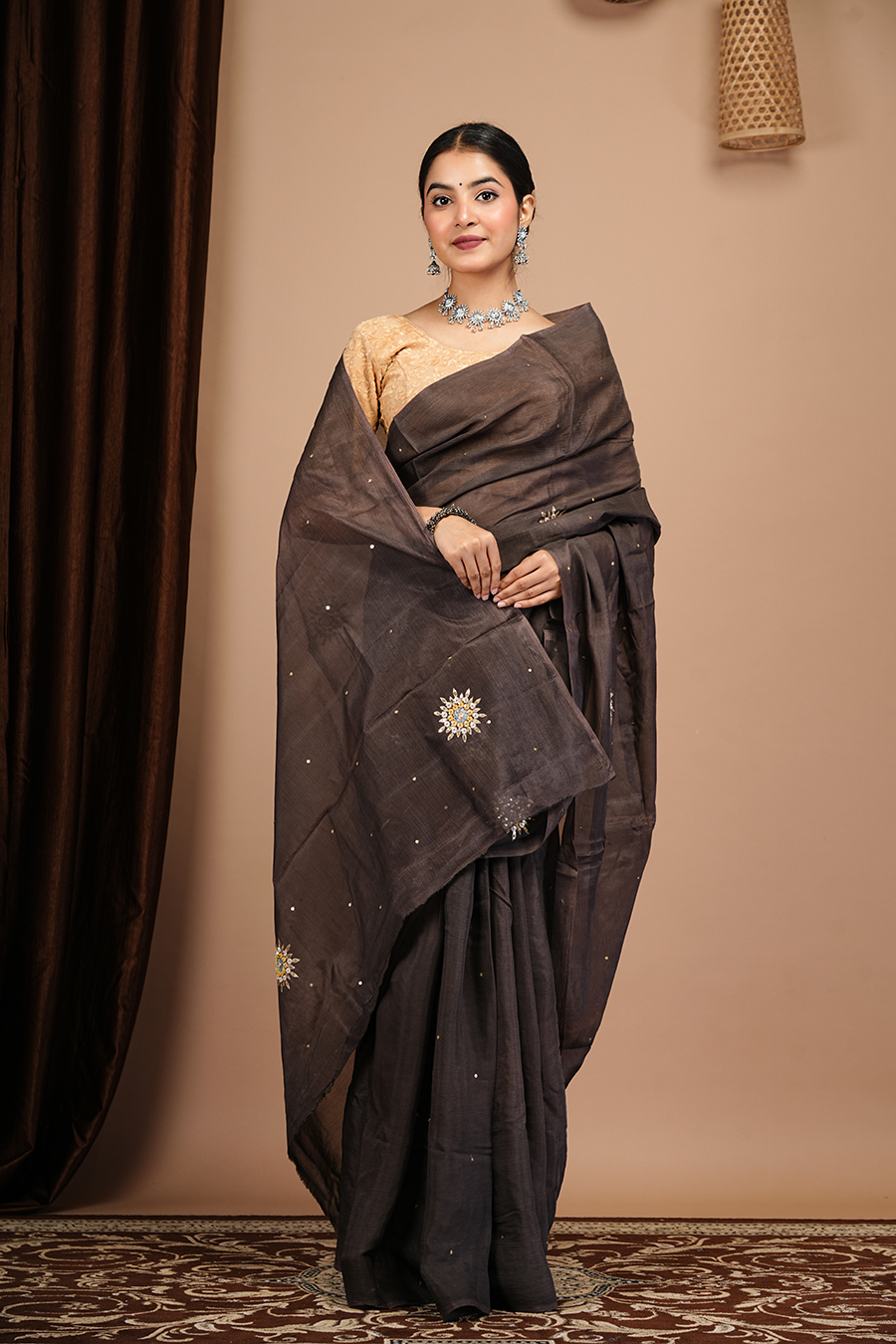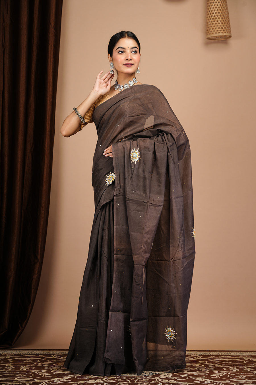 This Chocolate chinnon saree with boota work, For booking or more details, you can contact us via call or WhatsApp at 9509482467.