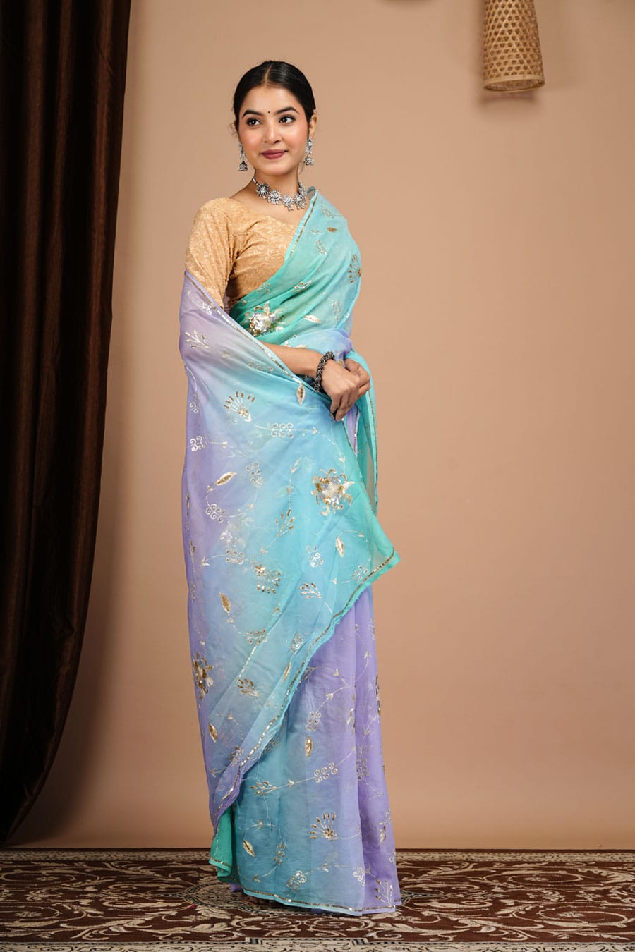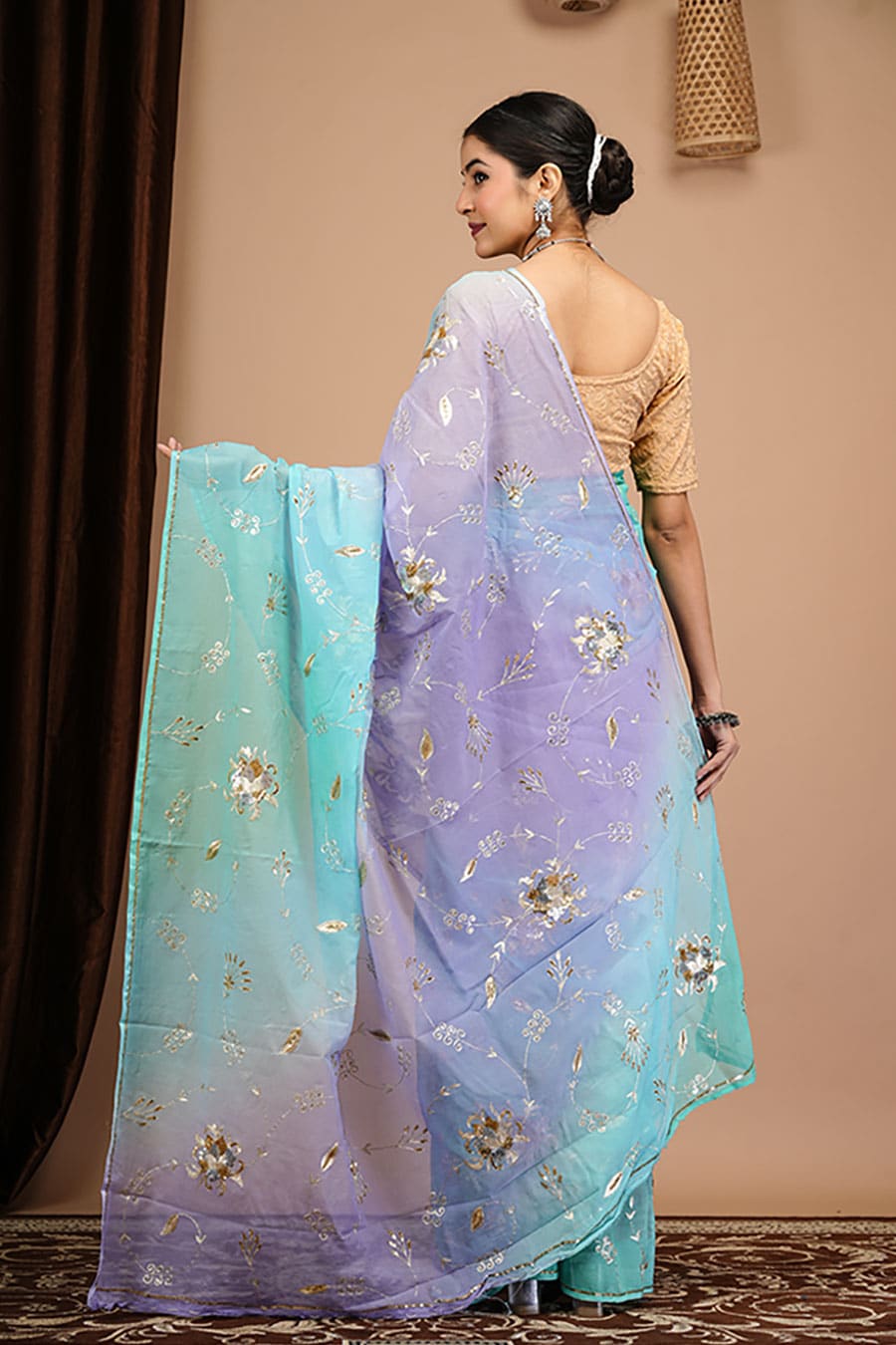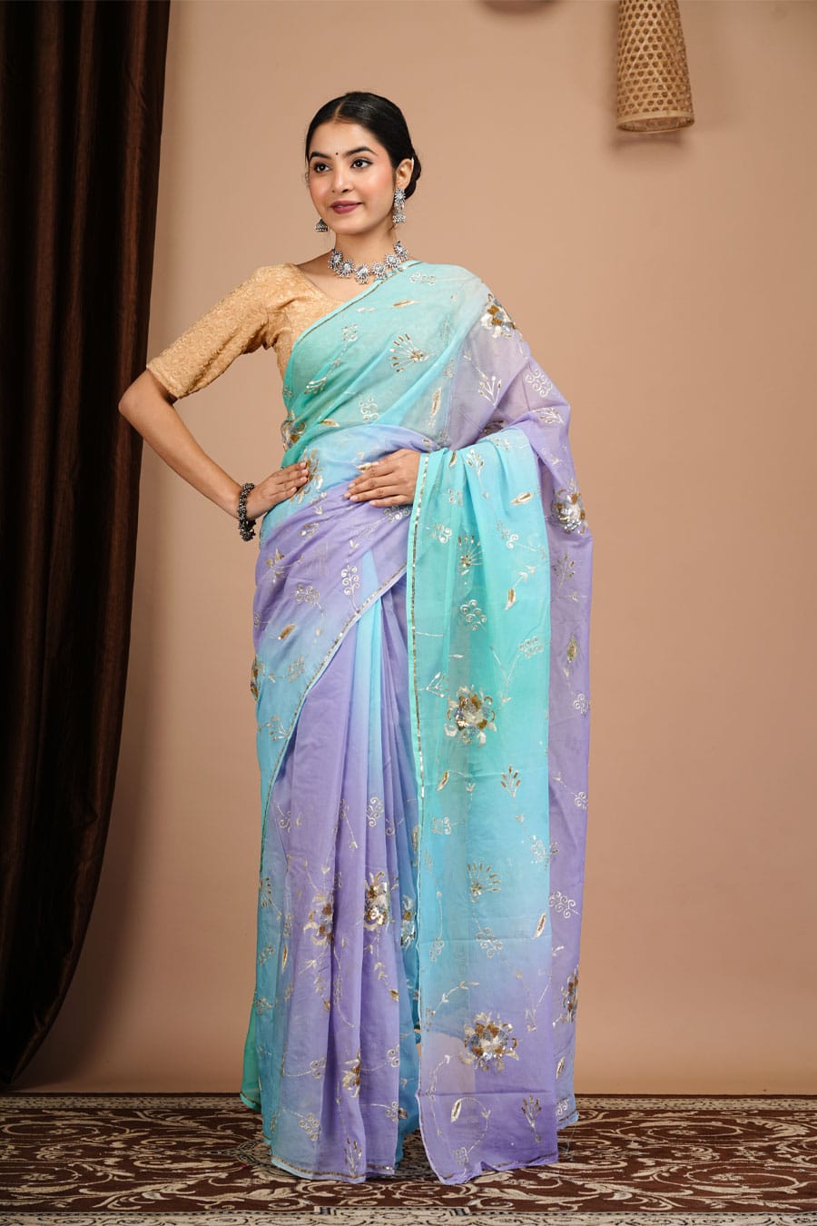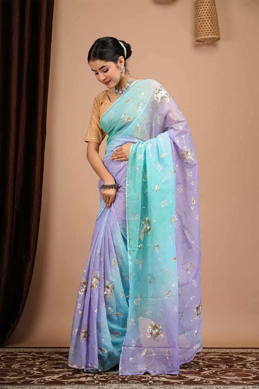 This diamond chiffon saree in purple and sky blue shades with heavy aari-tari work