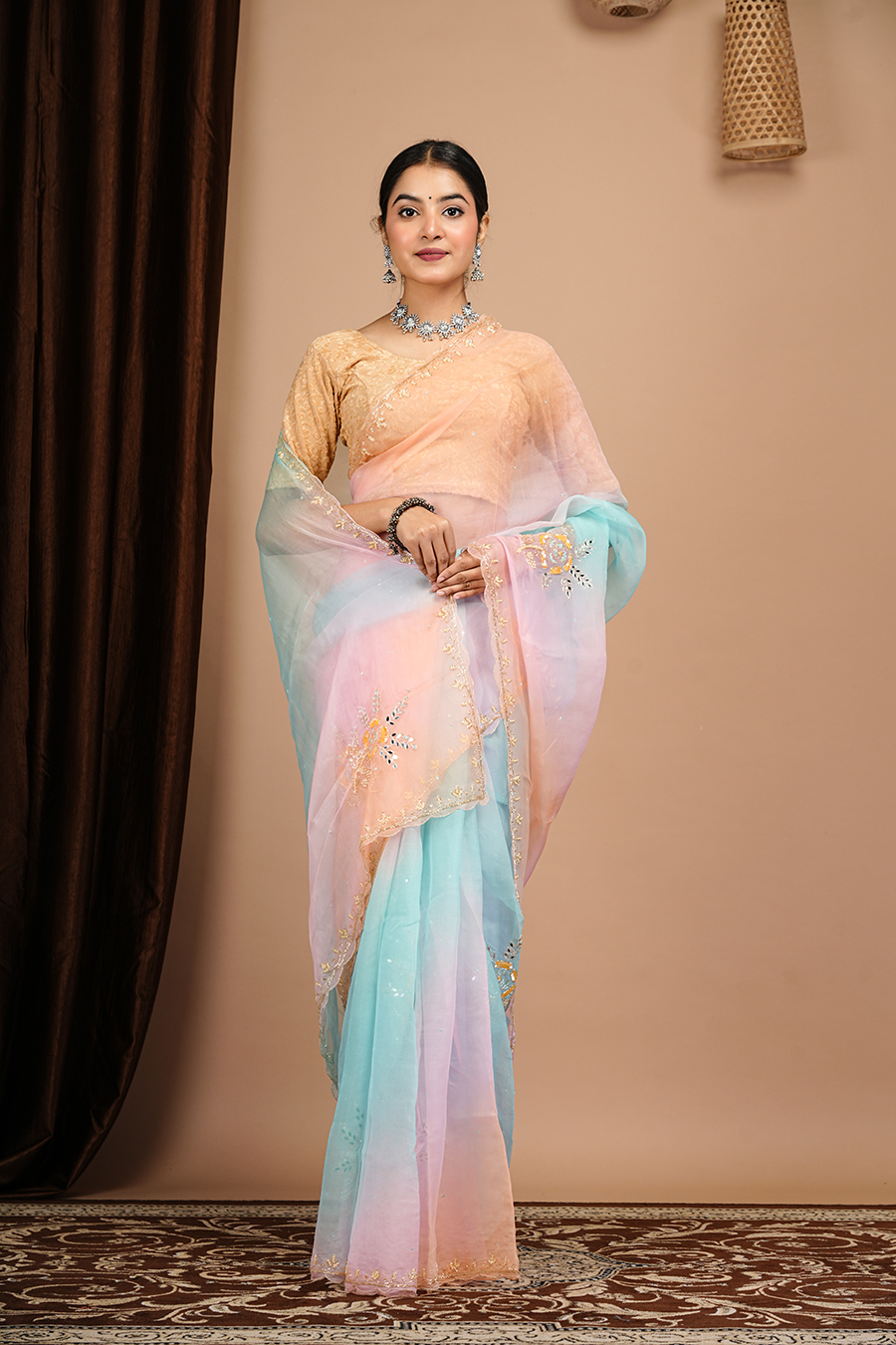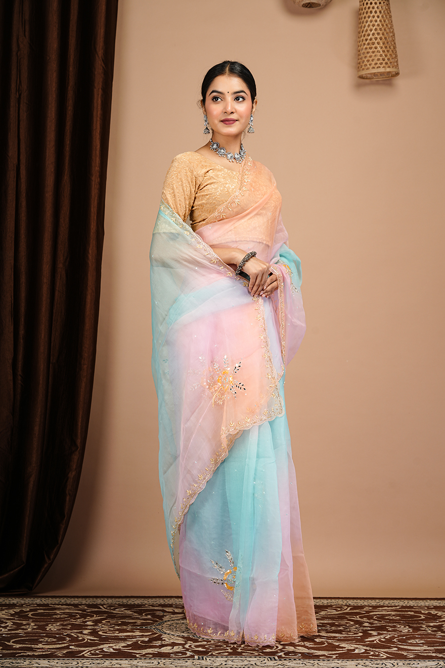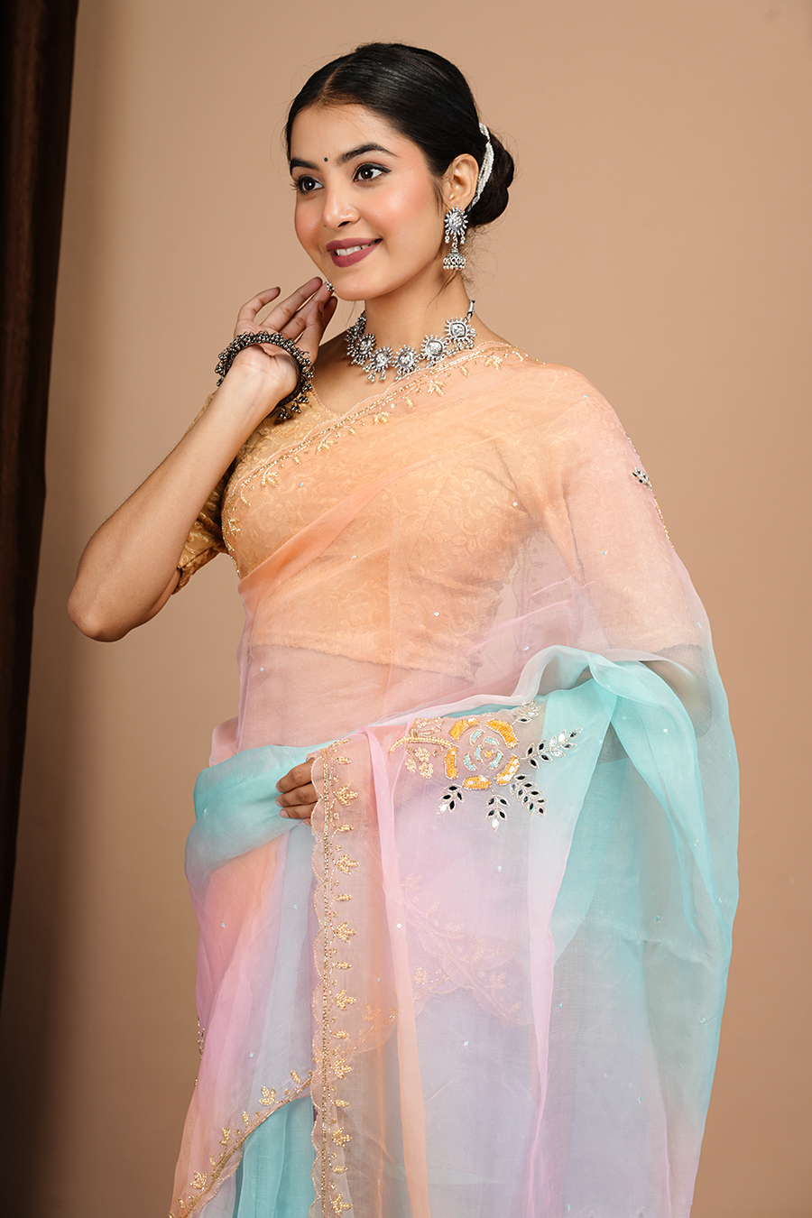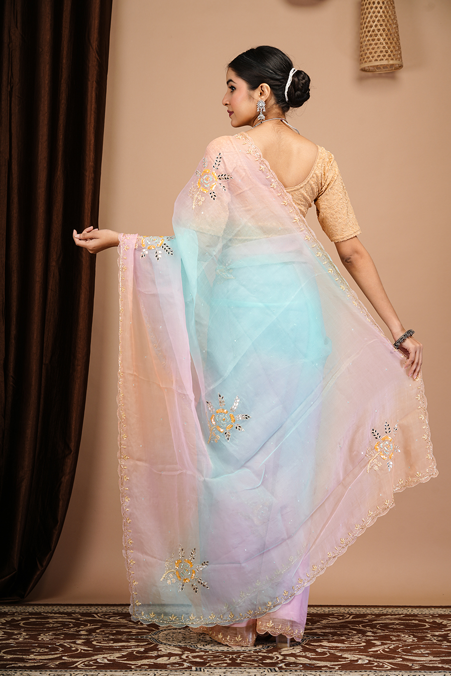 This multi shade organza saree with aari tari work, For booking or more details, you can contact us via call or WhatsApp at 9509482467.